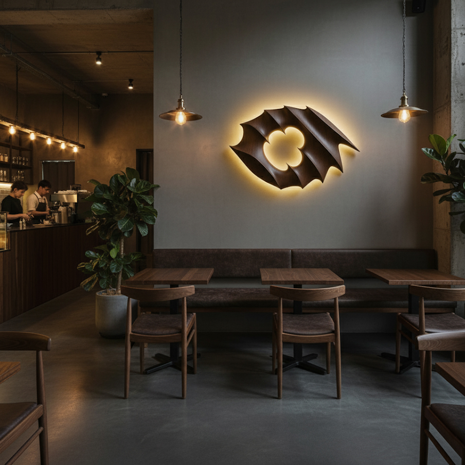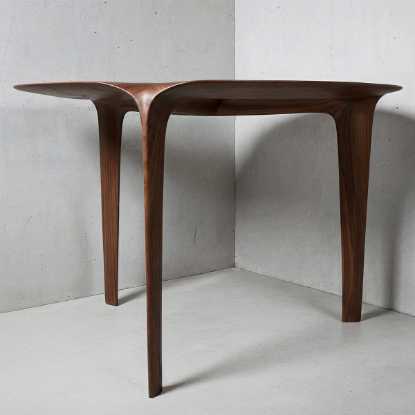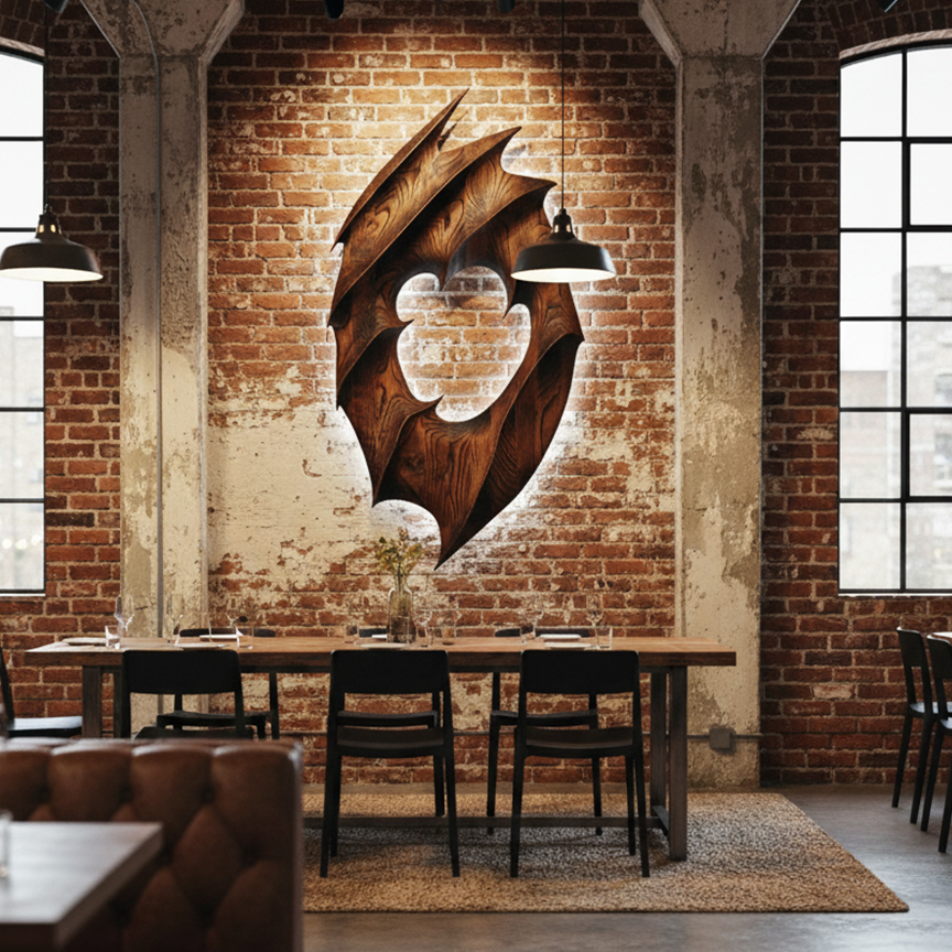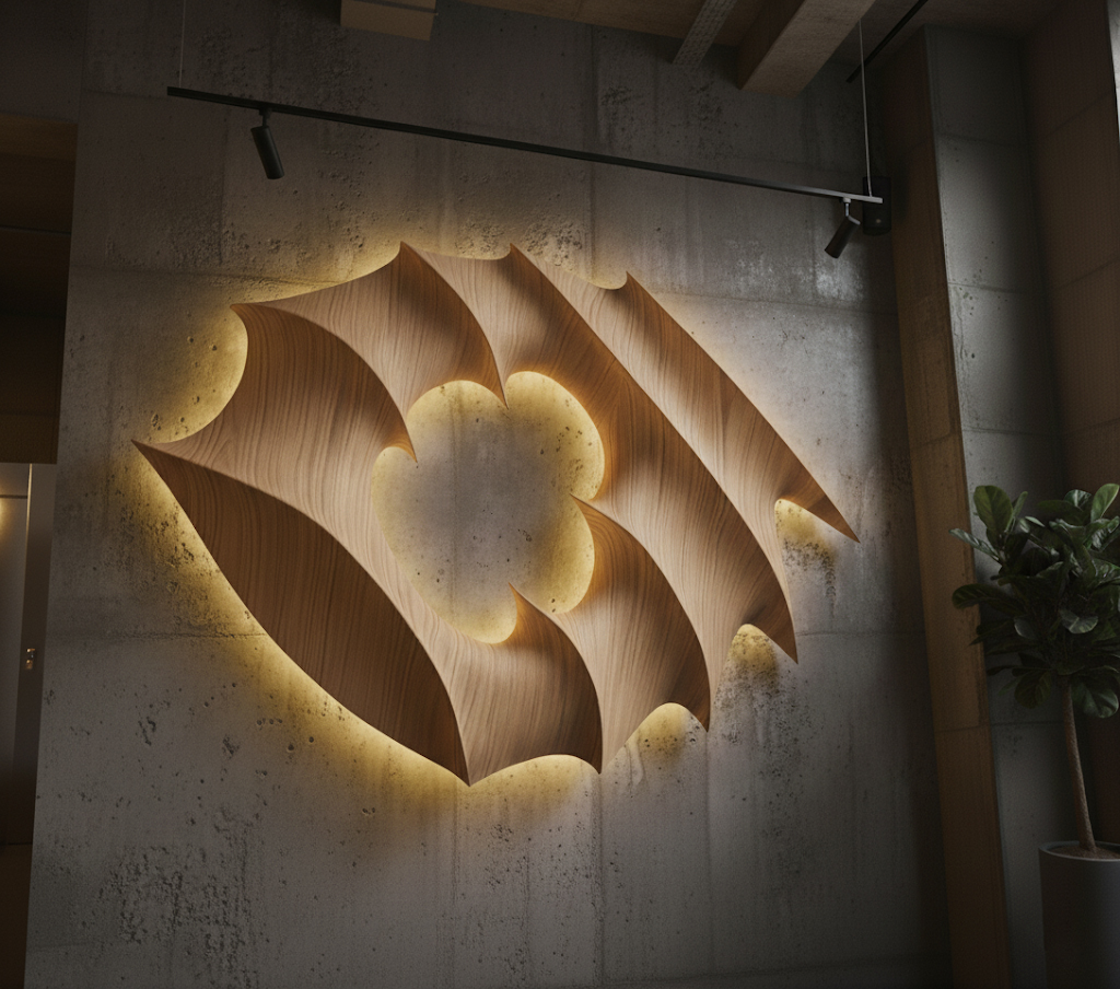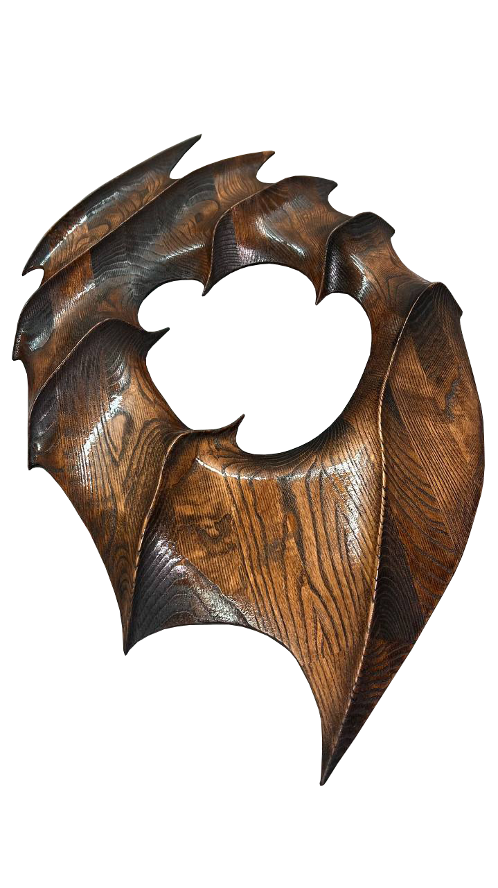 Carved from wood and illuminated from within, it captures a sense of motion and stillness in perfect harmony.