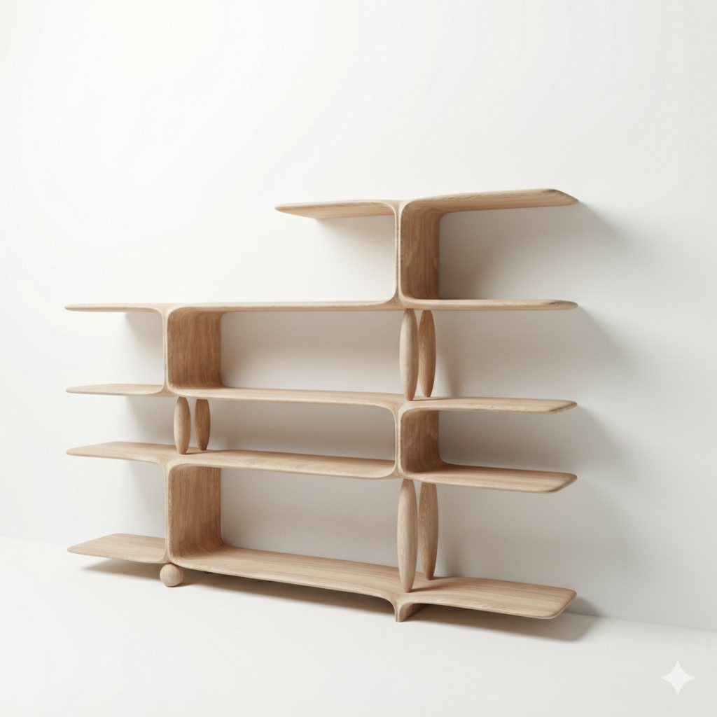 The Epsilon shelving unit extends the collection’s language of continuity and flow into a vertical composition. Its surfaces unfold in a sequence of soft transitions, where shelves and supports merge as if shaped by gradual natural forces rather than assembled by hand. The structure feels eroded, grown, and refined over time, echoing the logic of landscapes and organic formations. Balancing presence and lightness, it functions as both storage and a sculptural element within the space.