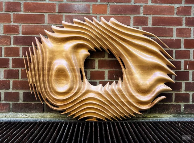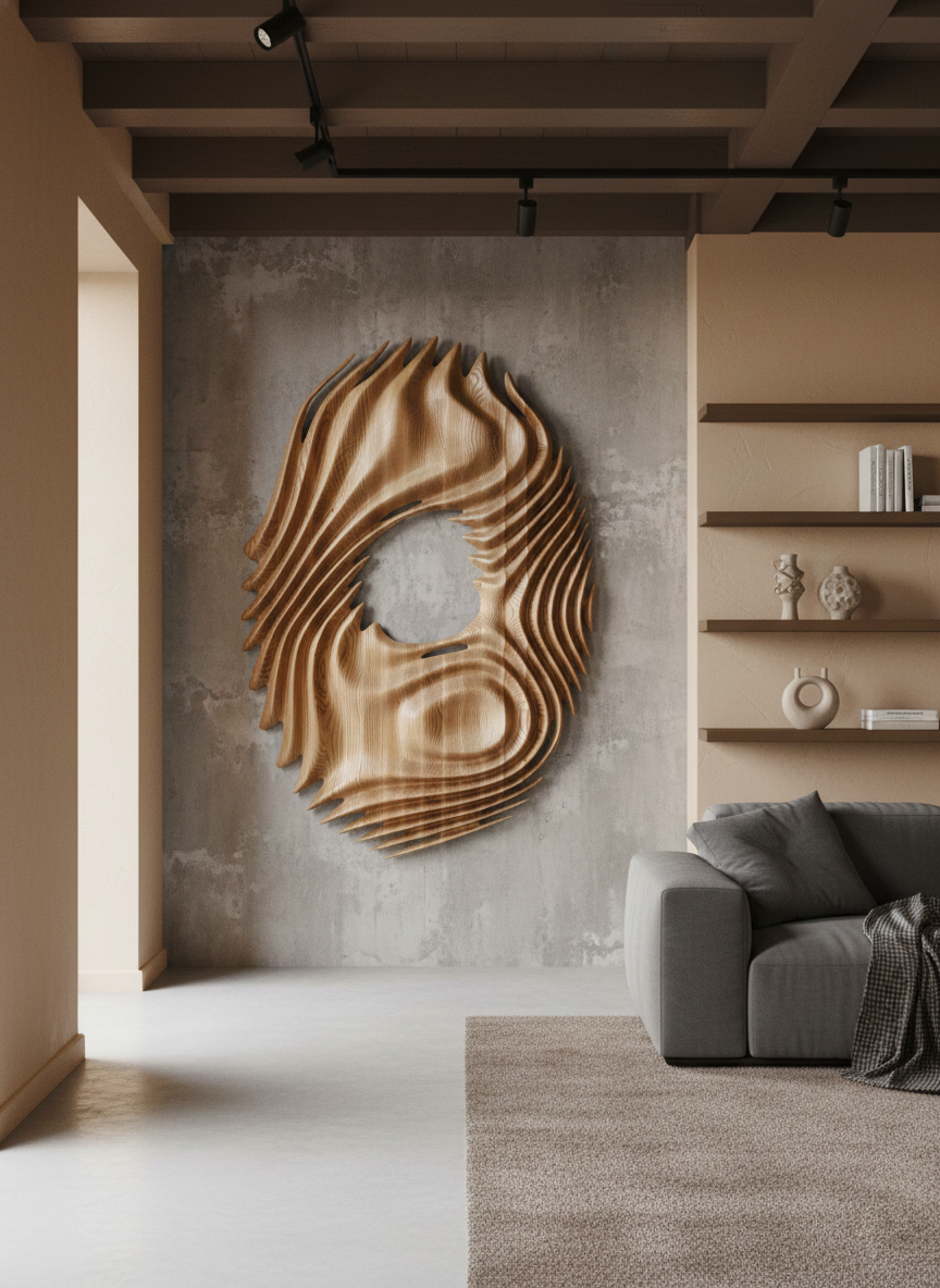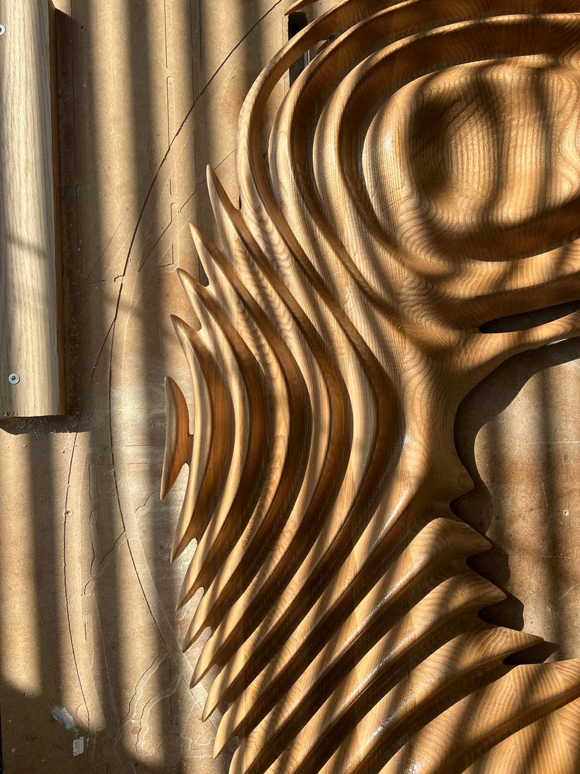 A statement piece crafted from solid ash wood, this sculptural wall panel embodies movement, depth, and organic geometry. Layered and CNC-carved with precision, its dynamic contours evoke natural flow – reminiscent of wind, water, or sound waves frozen in motion.