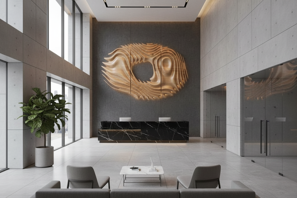 The piece is designed as a large-scale architectural artwork that transforms any modern interior into a space of visual rhythm and tactile warmth. Integrated LED backlighting enhances the layered relief, creating a captivating play of light and shadow.